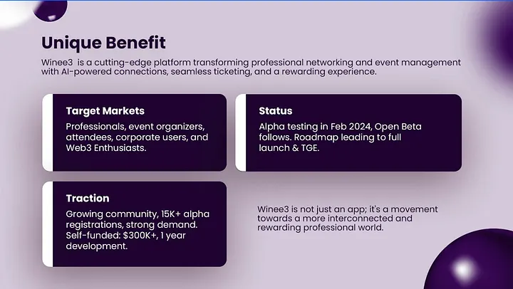 Winee3 is a cutting-edge SocialFi super-app that transforms professional networking with Web3 tech. It offers AI matchmaking, NFT event tickets, and token rewards for global connections, vibrant communities, and career growth. It's an all-in-one platform where users can showcase skills, join events, and earn rewards, all powered by blockchain. With a user-centric approach and a goal to mainstream Web3, Winee3 is set to reshape professional networking.
